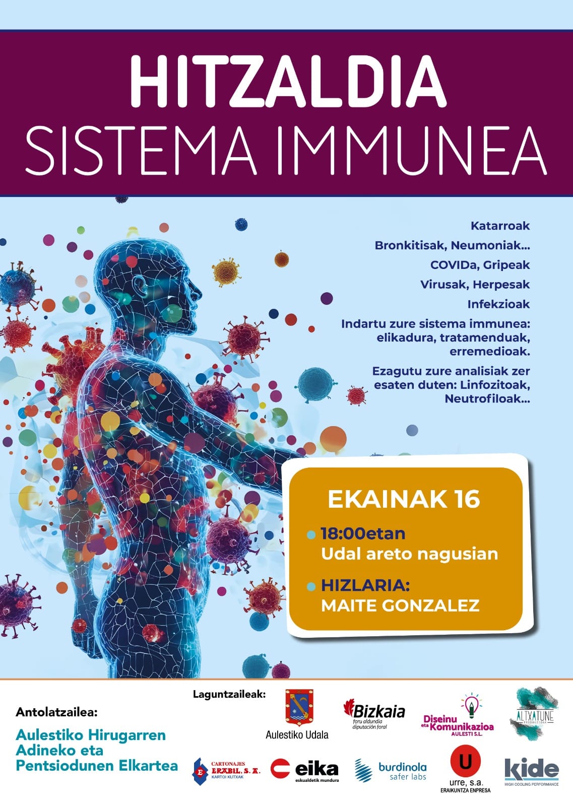 Sistema inmuneari buruzko hitzaldia egongo da Aulestin ekainaren 16an [astelehena], 18:00etan, udal areto nagusian. Maite Gonzalez izango da hizlaria Aulestiko hirugarren adineko eta pentsiodunen elkarteak antolatutako hitzaldian.