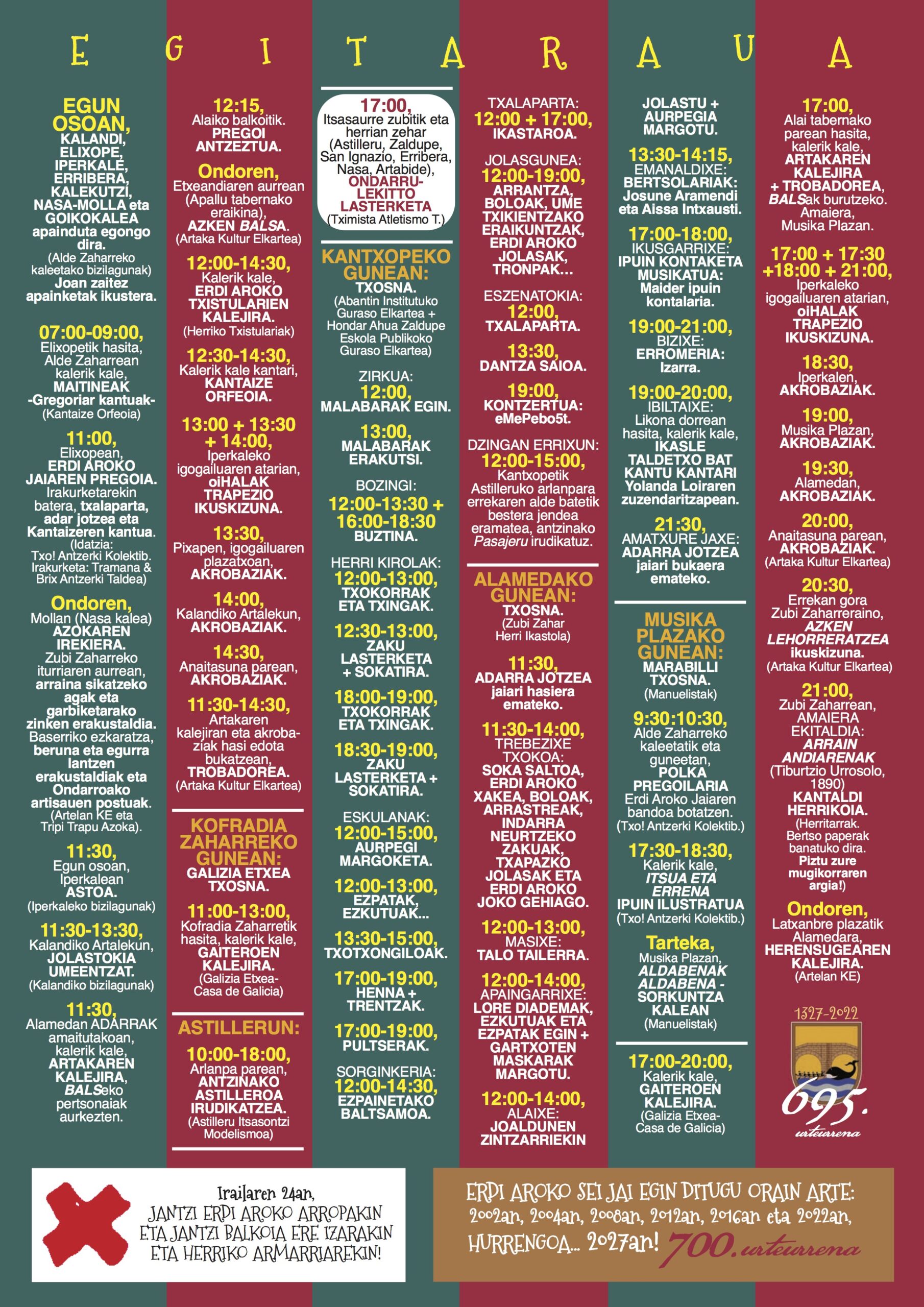 Erdi Aroko jaia ospatuko dute irailaren 24an, Ondarroan; Ondarroako Hiribilduaren 695. urteurrena (1327-2022). Egun osoko jaia izango da, 07:00etatik aurrera ospatuko dena, eta egitarau zabala prestatu dute. Zubi Barritik Alamedara bitartean eta Kaleandi, Ekixope, Iperkale, Erribera, kalekutzi, Nasa-molla eta Goikokaean zehar ospatuko da jaia. HEMEN EGITARAUA