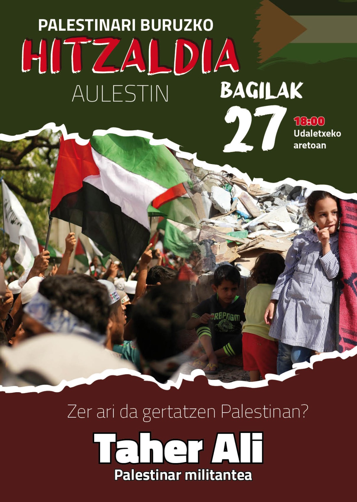 Zer ari da gertatzen Palestinan? izenpean hitzaldia egongo da Aulestin ekainaren 27an [barikua], 18:00etan Udaletxeko aretoan. Taher Ali palestinar militanteak emango du hitzaldia.