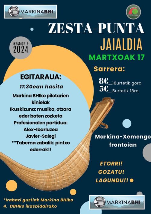 Markina BHIko ikasleek zesta punta jaialdia antolatu dute. Martxoaren 17an, 11:30etik aurrera Markina-Xemeingo frontoian jarri dute hitzordua. 18 urtetik aurrerakoen sarrera 8 euroren truke eskuratu ahal izango da; 5 urtetik 18ra bitartekoena, berriz, 5 euroren truke.