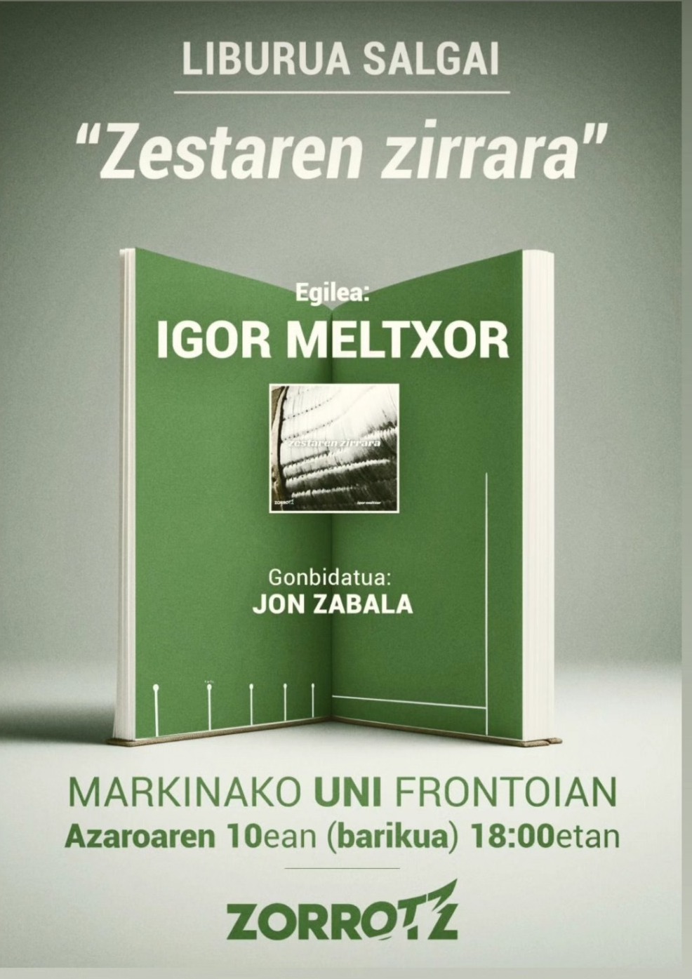 Igor Meltxorren Zestaren zirrara liburuaren aurkezpena azaroaren 10ean 18:00etan, Uni frontoian. Gonbidatua Jon Zala puntista izango da.